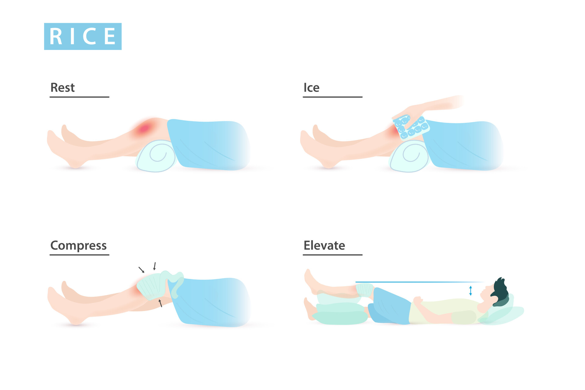 - R.I.C.E Protocol : Follow the R.I.C.E protocol (Rest, Ice, Compression, Elevation) to reduce pain and inflammation. Apply ice to the affected area for 15-20 minutes every few hours, and elevate the injured limb above heart level.